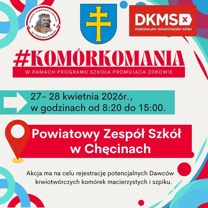 Powiatowy Zespół Szkół w Chęcinach włącza się w program Szkoła Promująca Zdrowie i stawia na działania, które nie kończą się na lekcji czy plakacie na korytarzu. #KOMÓRKOMANIA ma przede wszystkim praktyczny wymiar – chodzi o rejestrację nowych potencjalnych dawców krwiotwórczych komórek macierzystych i szpiku.